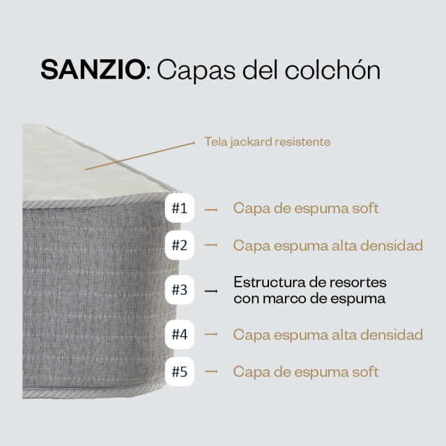 - El marco de espuma perimetral que rodea la estructura de resortes reduce los movimientos laterales del colchón.