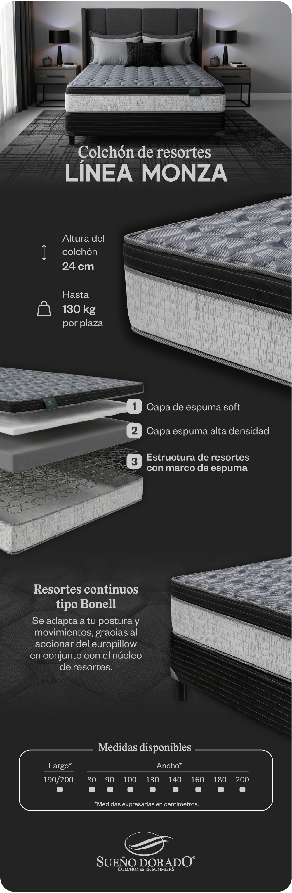 3- Estructura central de resortes tipo bonell con distribución continua + marco perimetral de espuma de alta densidad para mayor solidez y vida útil.